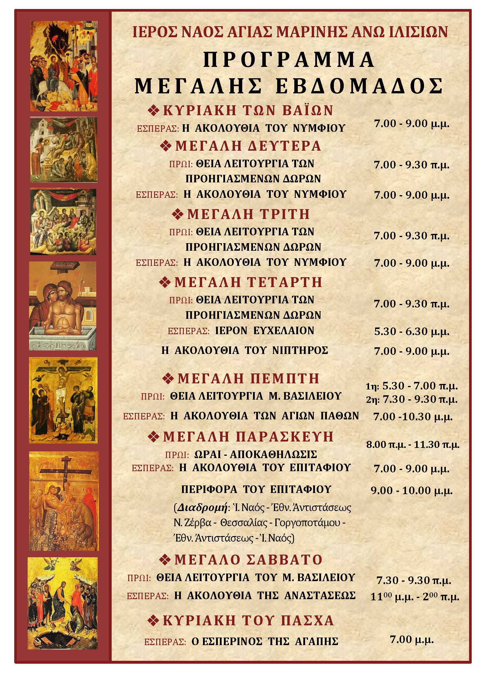 Κατά την περίοδο της Αγίας και Μεγάλης Τεσσαρακοστής (23 Φεβρουαρίου έως 03 Απριλίου 2026) κάθε εβδομάδα τελούνται οι εξής ακολουθίες: